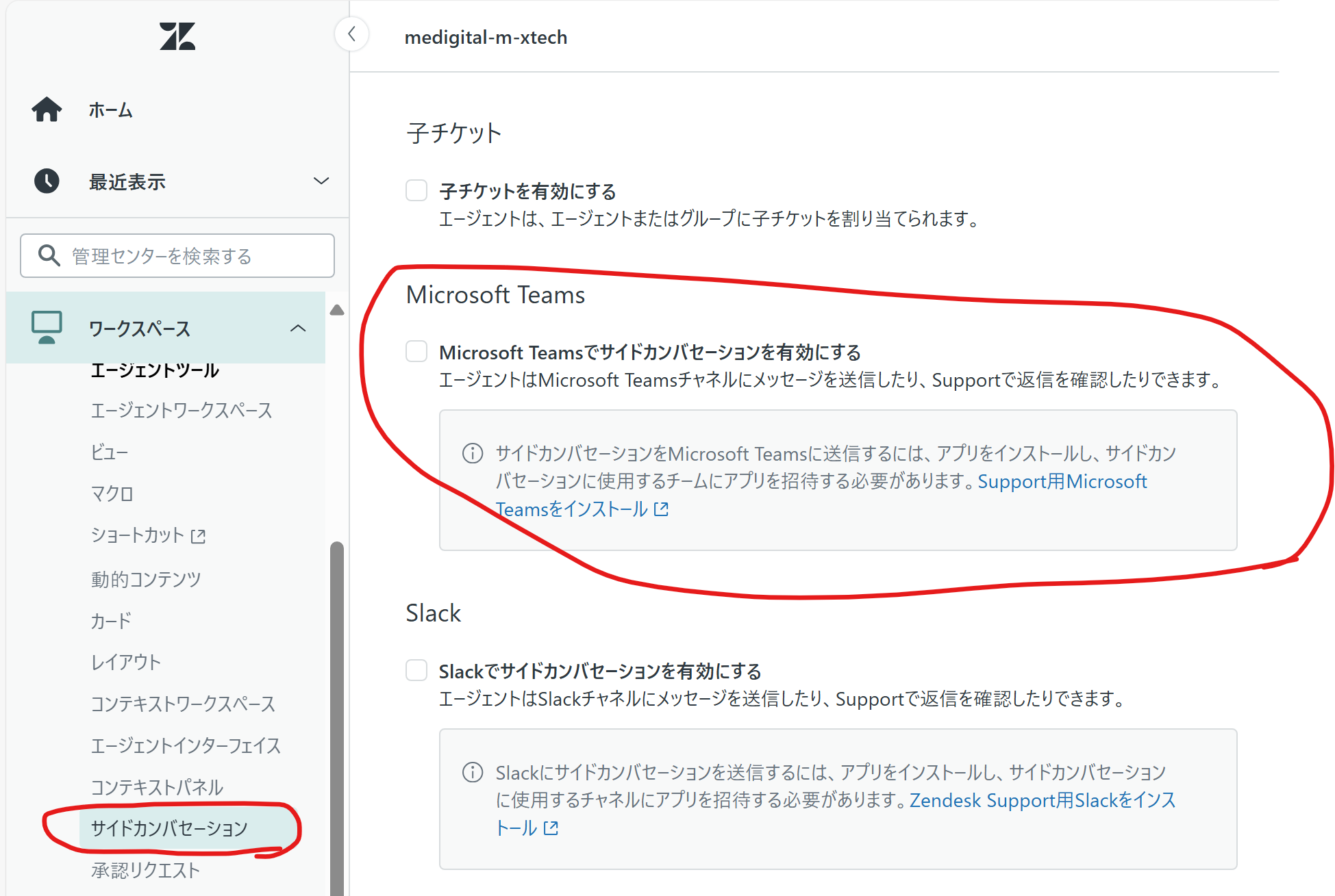そのため、以図の「Microsoft Teamsでサイドカンバセーションを有効にする」のチェックはオンにしないでください(デフォルトはオフになっています。)