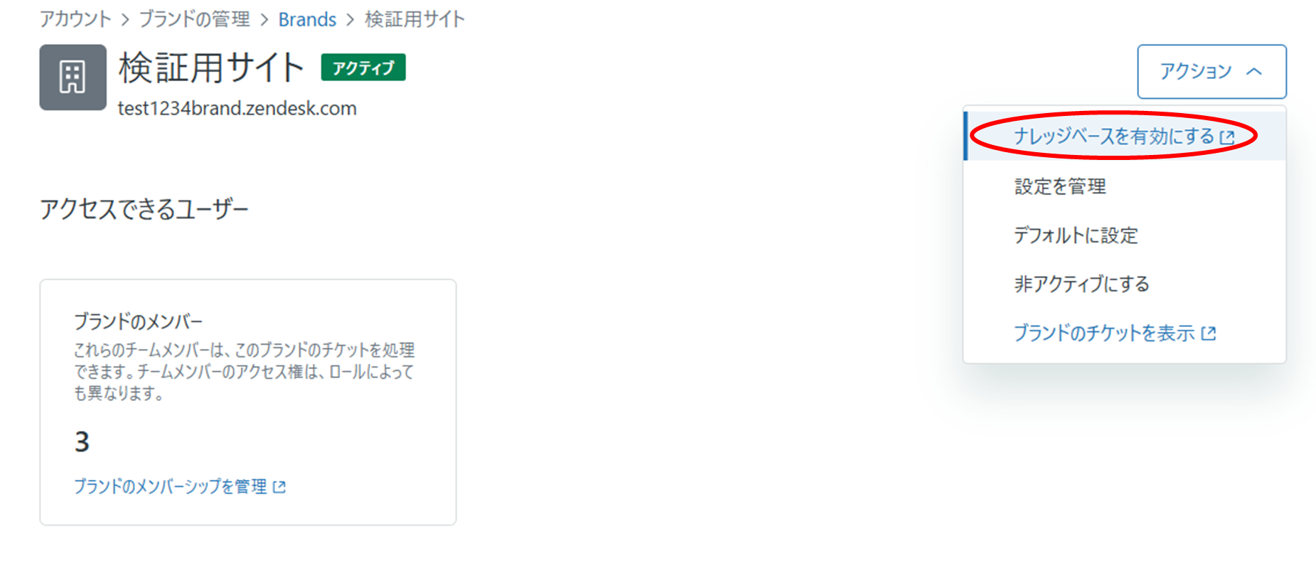 ③ブランドが作成されたら、[アクション]のブルダウンを展開して、[ナレッジベースを有効にする]をクリックする。