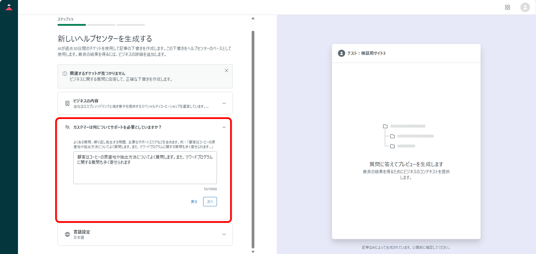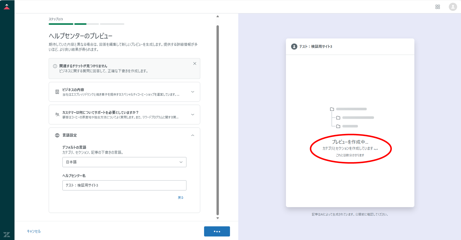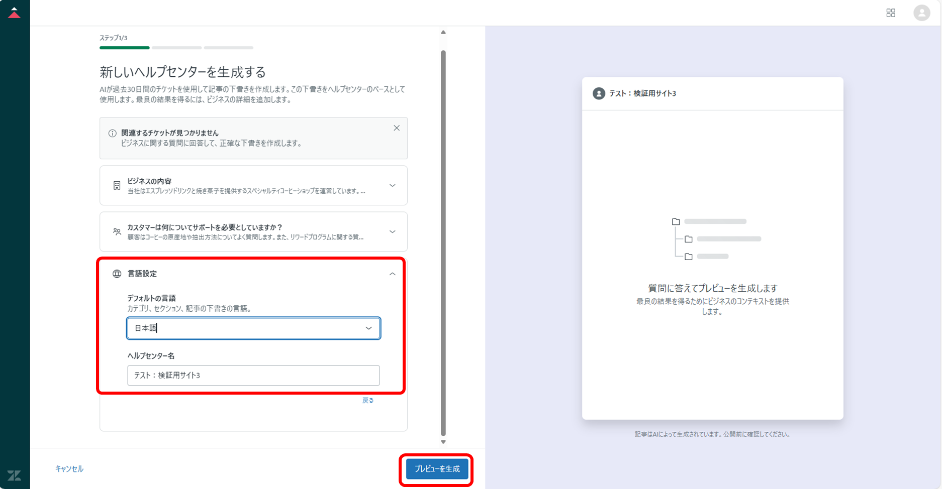 ⑦[言語設定]および[ヘルプセンター名]を入力し、[プレビューを生成]をクリックする。