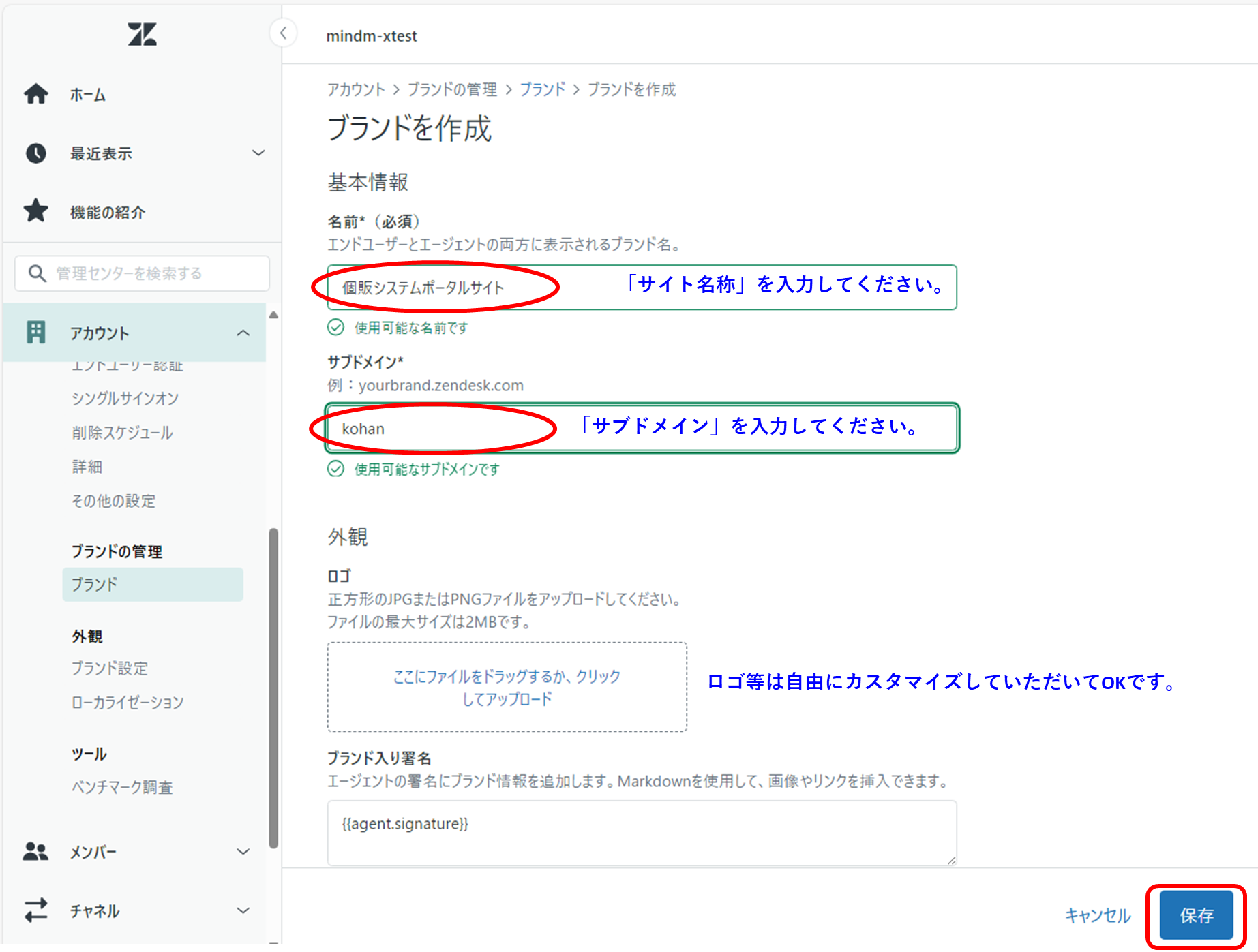 ブランドの作成方法とヘルプセンターの作成方法は以下のとおりです。