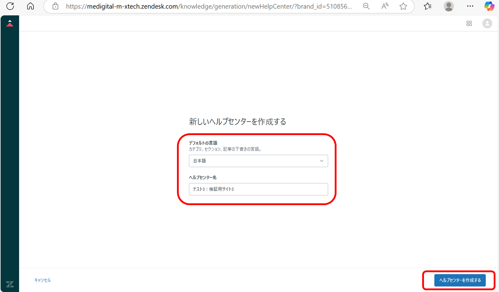 ⑭「デフォルトの言語」および「ヘルプセンター名」を確認し、「ヘルプセンターを作成する」をクリックする。