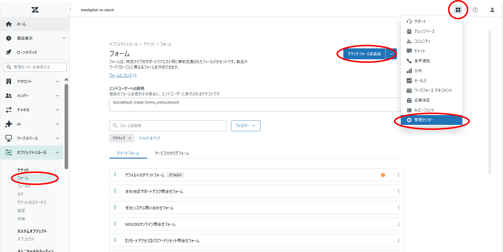 ①管理センターにアクセスし、画面左側メニューからオブジェクトとルール<チケット<フォーム を選択し、[チケットフォームを追加]ボタンをクリックする。