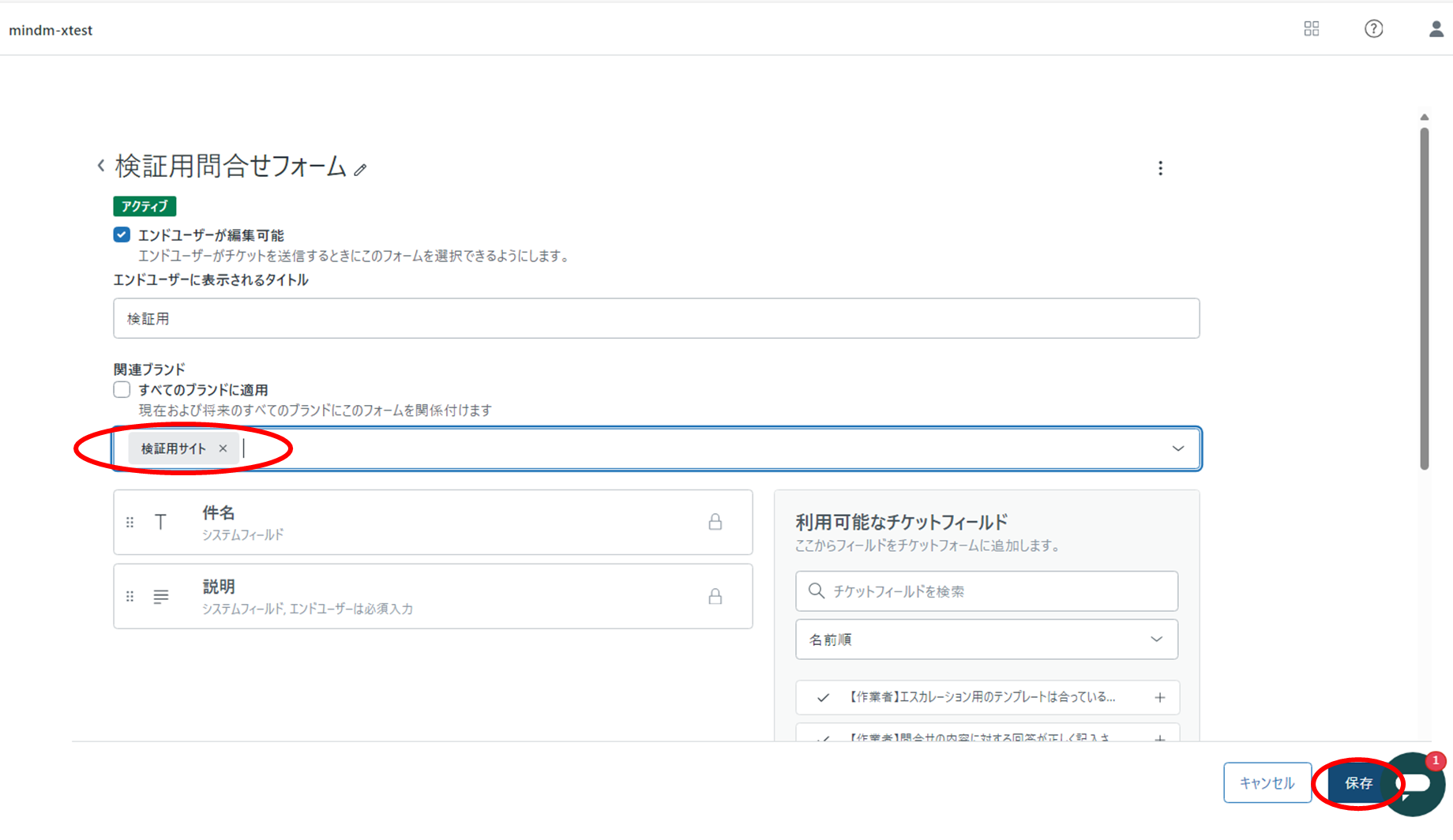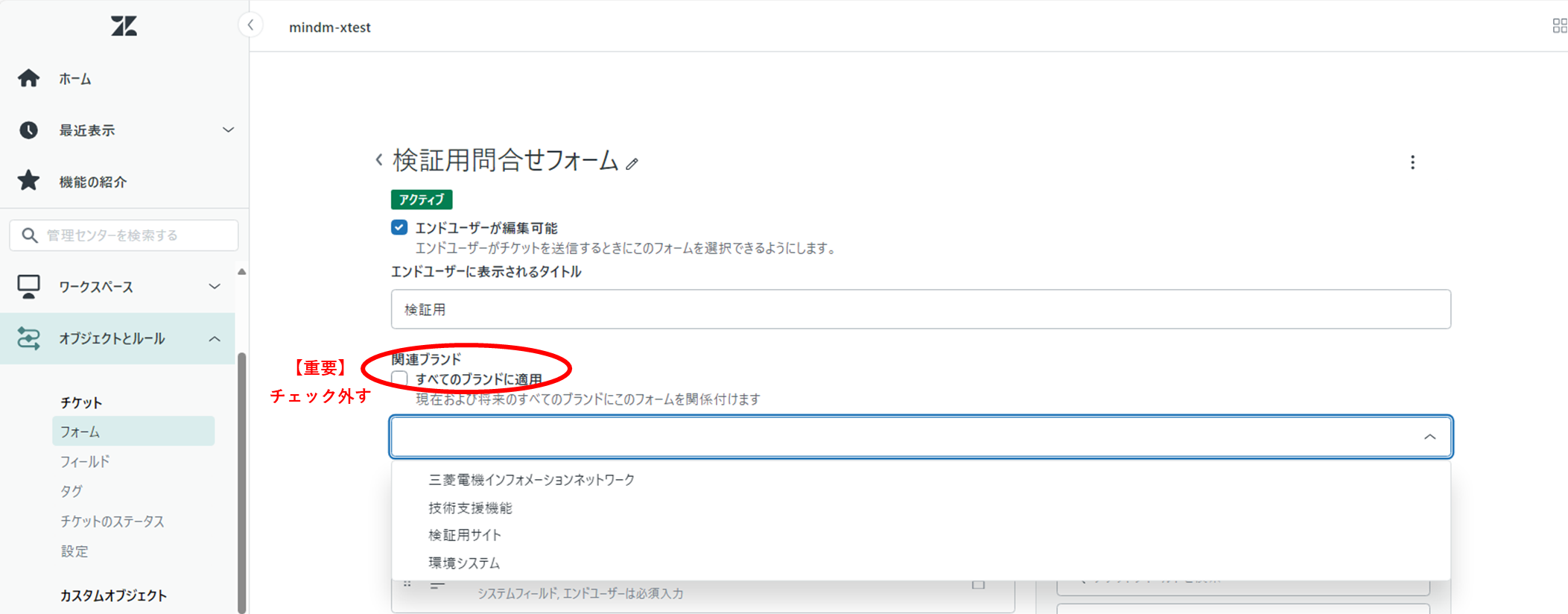 ③[すべてのブランドに適用]のチェックを外し、作成するチケットフォームを設置したいブランドをプルダウンから選択する。