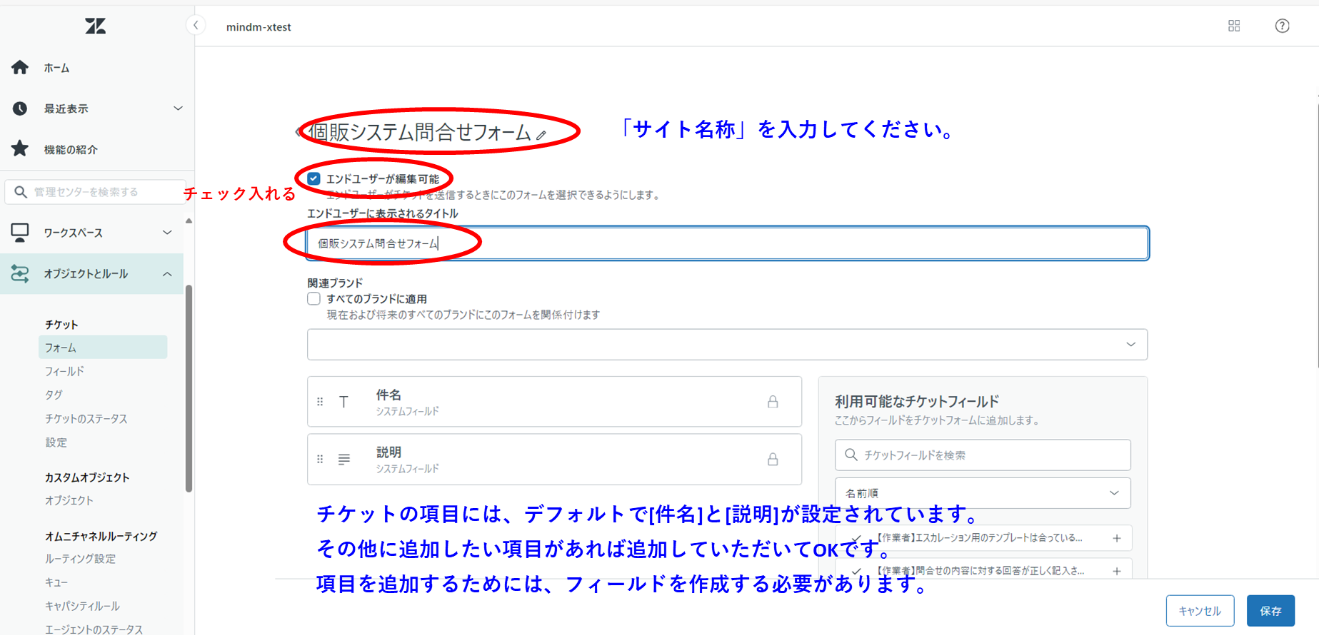 ユーザーから問合せを受けるためには、チケットフォームを作成する必要があります。