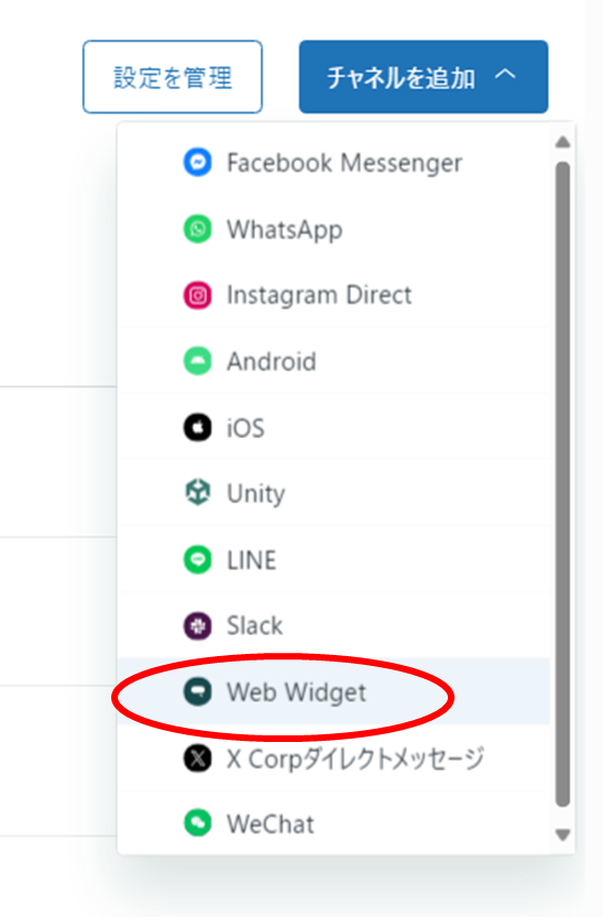 ②今回はヘルプセンターにチャットボットを設置するため、[Webwidget]を選択する。