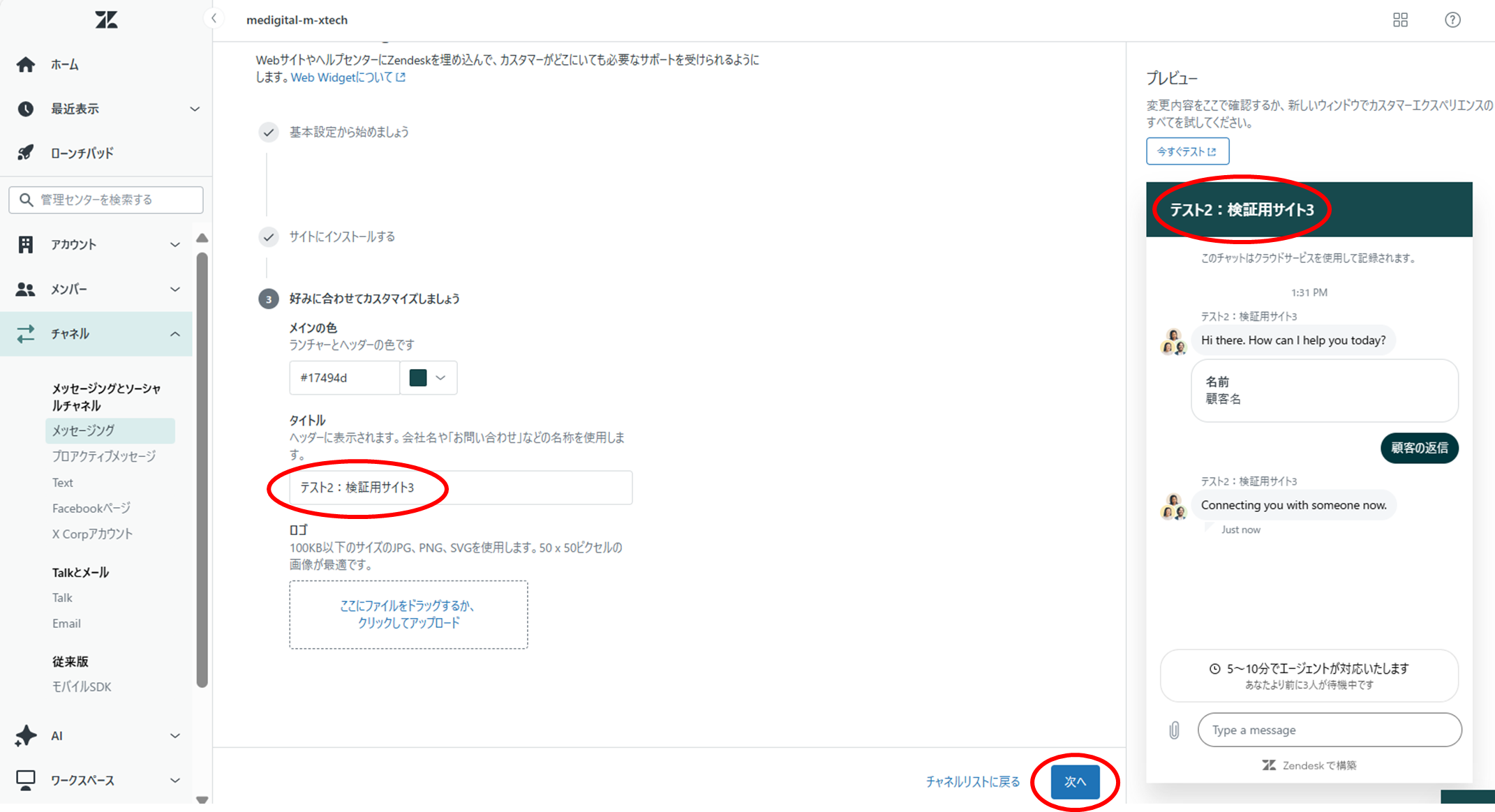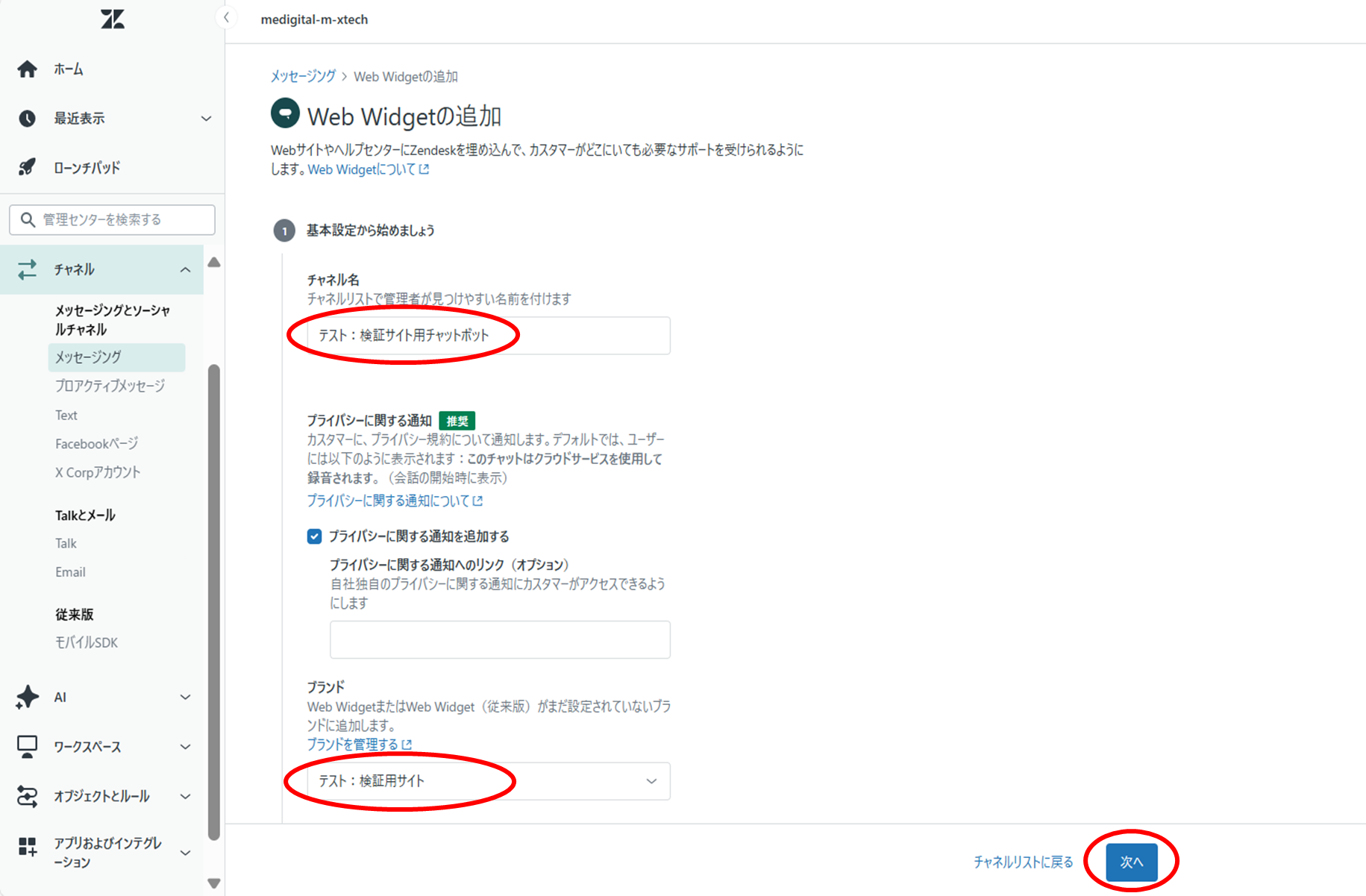 ③[チャネル名]の入力および、設置したい[ブランド]を選択し、[次へ]をクリックする。