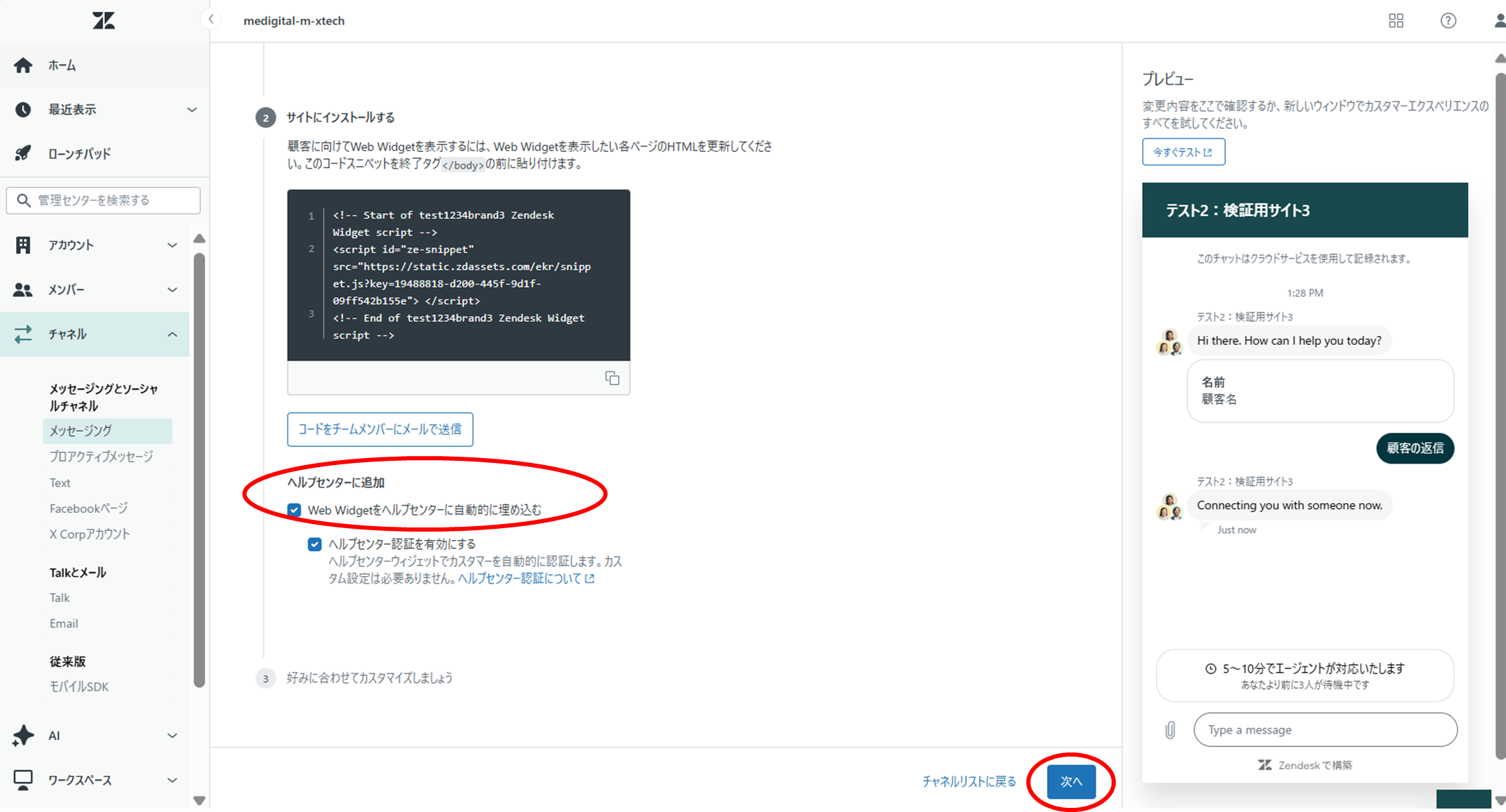 ④[ヘルプセンターにWeb Widgetを自動的に埋め込む]にチェックを入れ、[次へ]をクリックする。