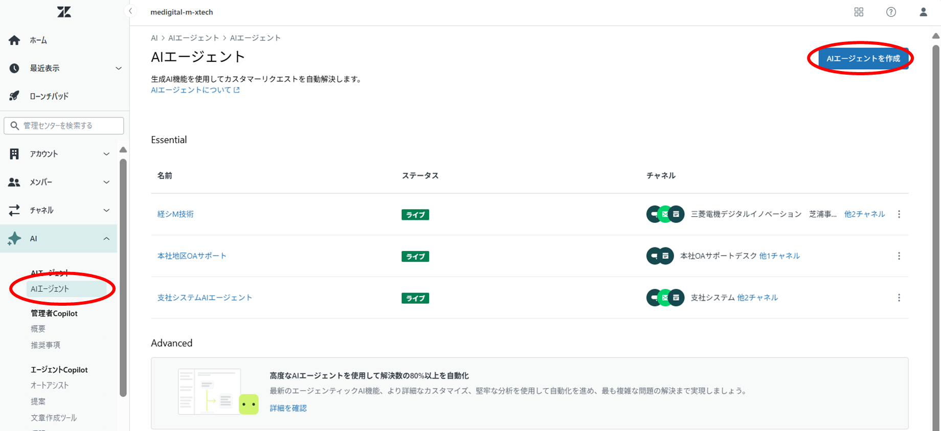 ⑦画面左側のメニューからAI<AIエージェントを選択し、[AIエージェントを作成]をクリックする。