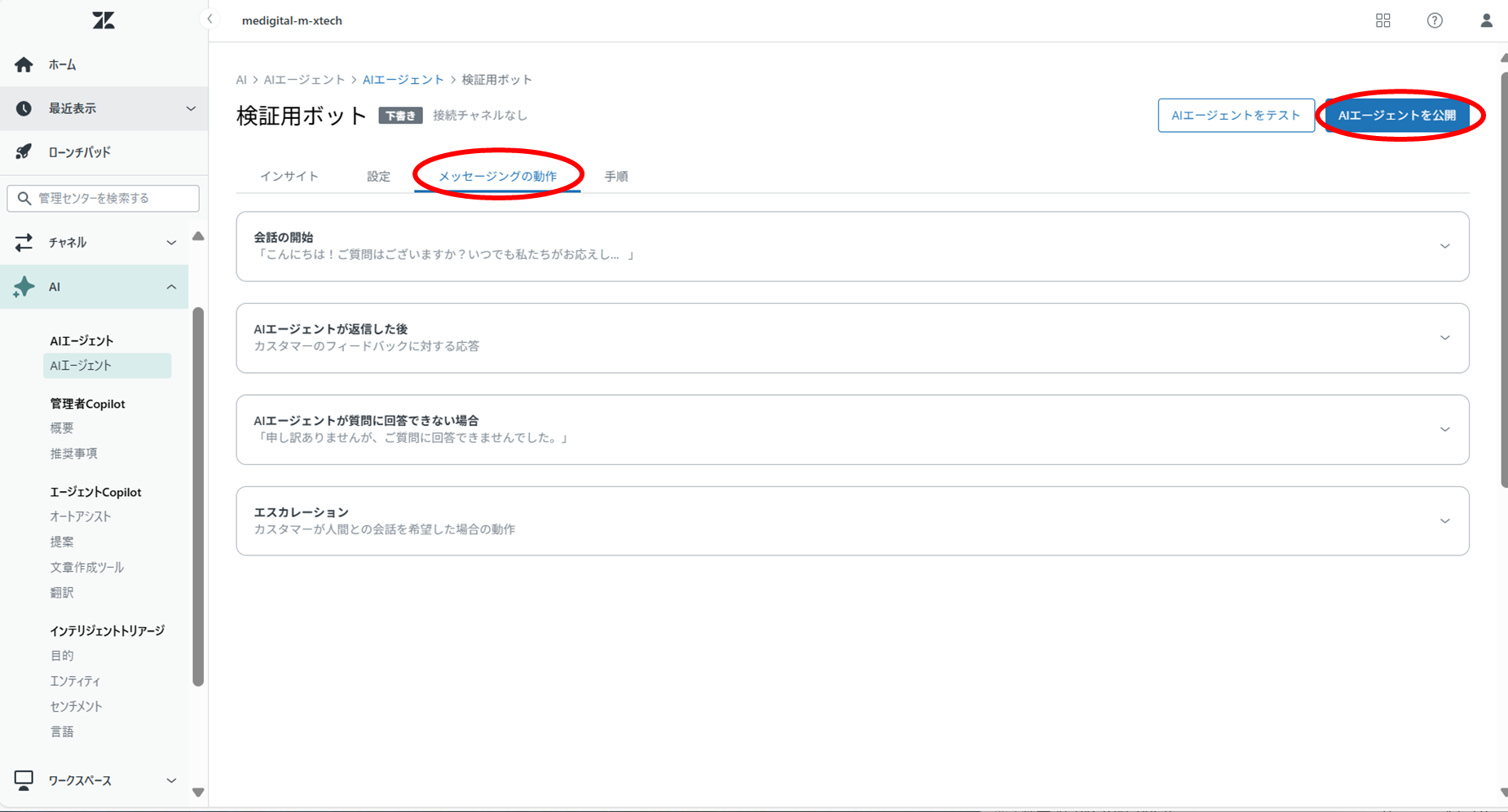 ⑫[メッセージングの動作]を確認および設定し、[AIエージェントを公開]をクリックする。