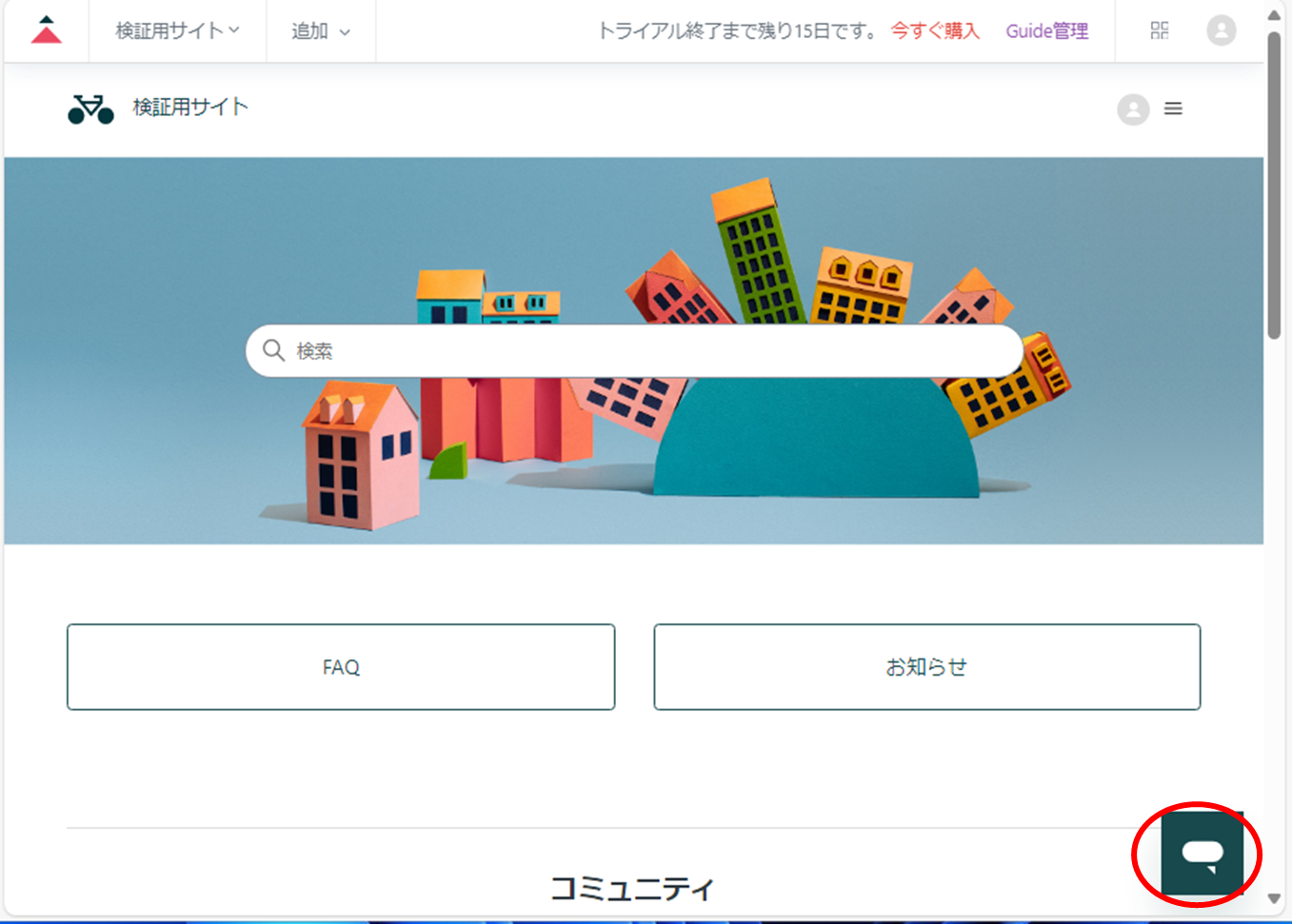 ⑭該当のヘルプセンターに遷移し、画面にチャットボットが設置されたことを確認する。