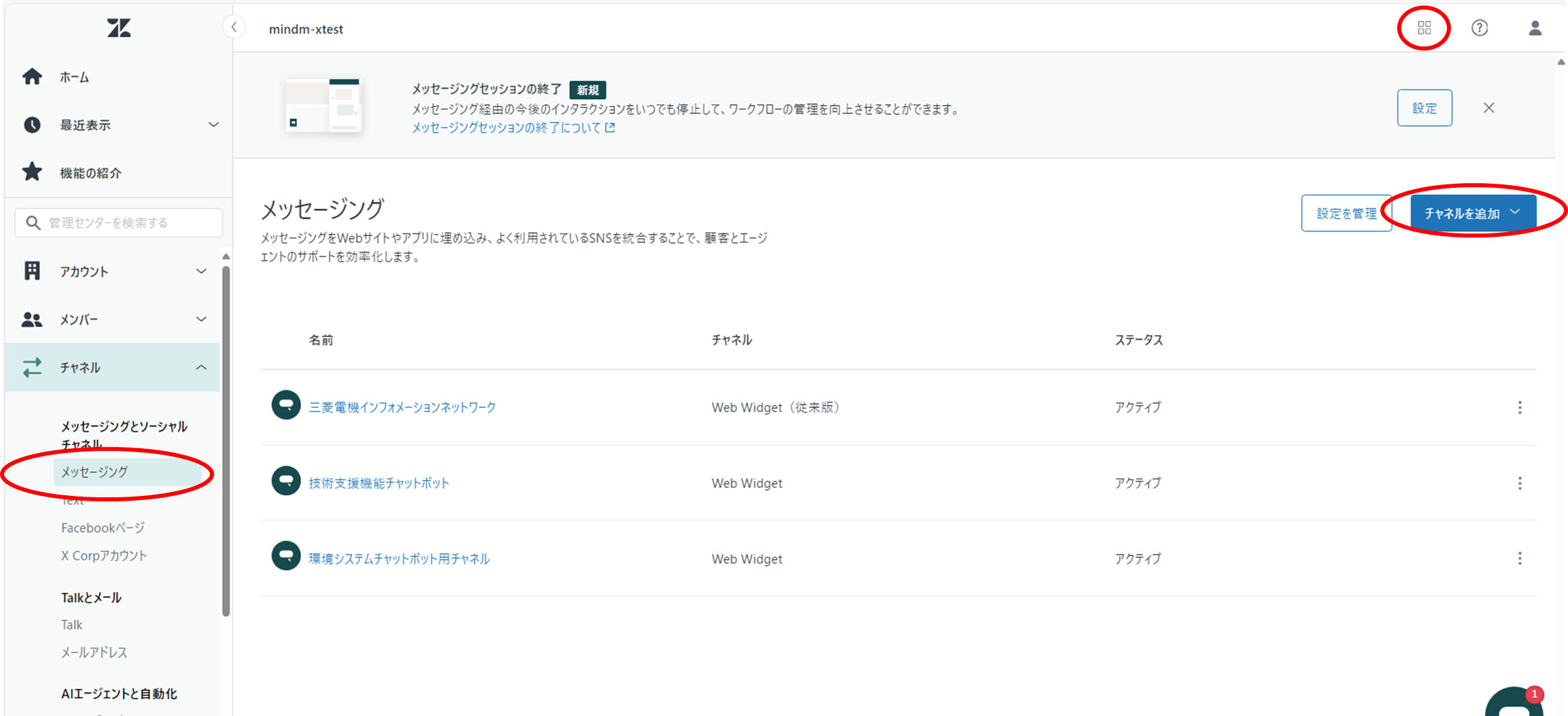 ①管理センターにアクセスし、画面左側のメニューから、チャネル<メッセージングを選択し、[チャネルを追加]ボタンをクリックします。