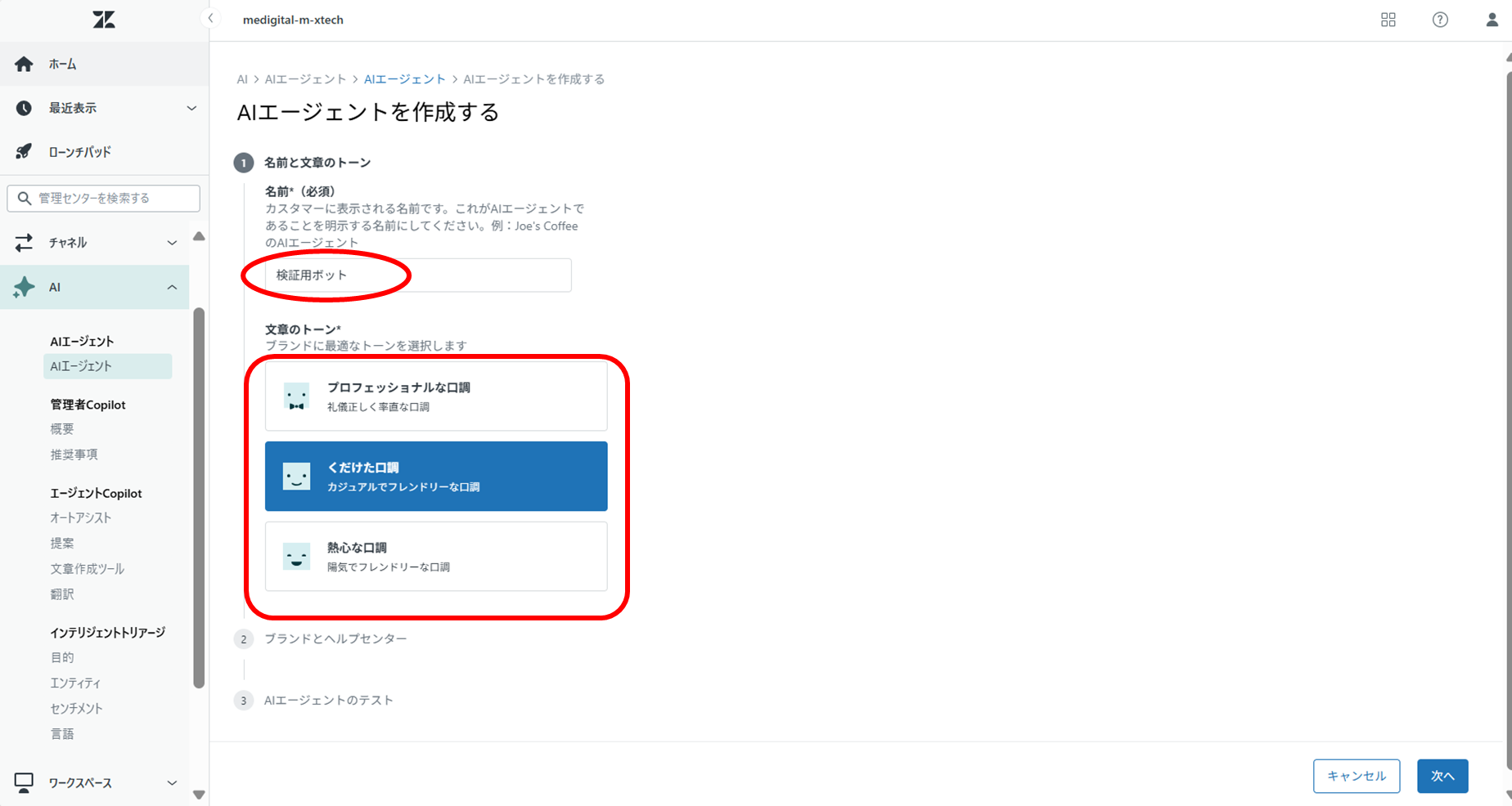 ⑧[ボット名]を入力および、[文章のトーン]を選択し、[次へ]をクリックする。